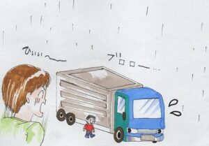派手に尻もちをついて転び、すぐに起き上がれなくなっている隙に、息子が車道に出て徐行してきた大型トラックに並走してよちよちと歩きました。